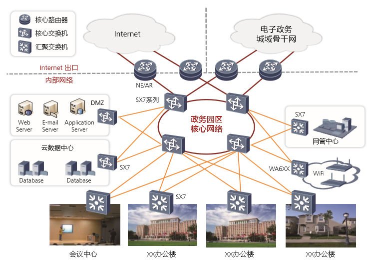 政府园区网络解决方案应用在政府办公园区内或园区与园区之间,通过MPLS VPN技术实现一张物理网和多张逻辑网,一网多用 可以有效的解决业务应用多、平台分散、效率低、政务数据易泄露等问题。